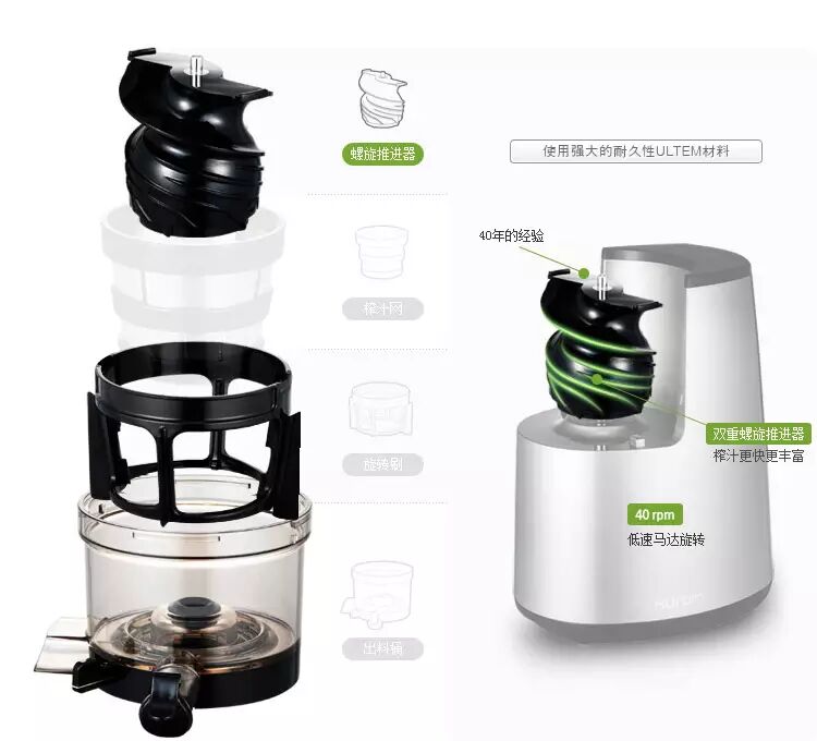 耐久性强,高强度的ULTEM材料制成的螺旋推进器,使材料低速榨汁。