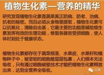 植物生化素,在国内外许多营养、医学专家预测是“二十一世纪新的维生素”,是蔬果用来保护自己免受大自然伤害的防护机制的产物,是一种天然化合物质,人体本身无法制造它们,必须从食物中获取,大豆中的黄酮素、西红柿里的茄红素、葫萝卜中的葫萝卜素等。