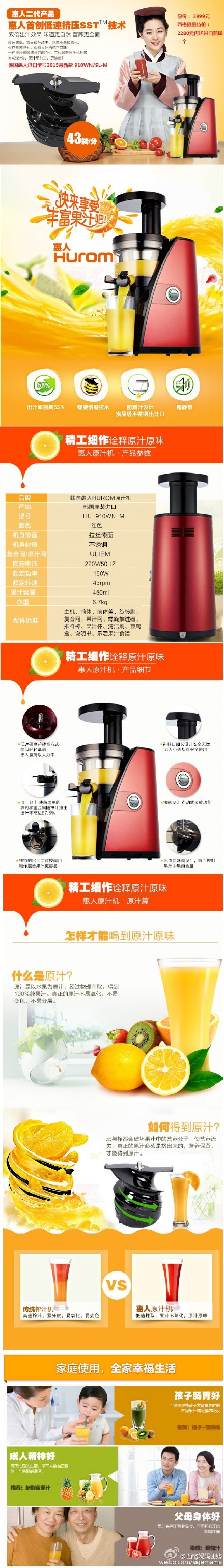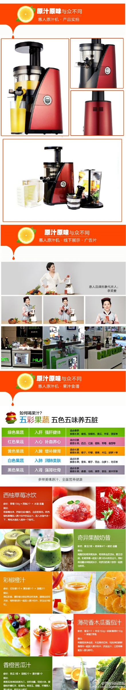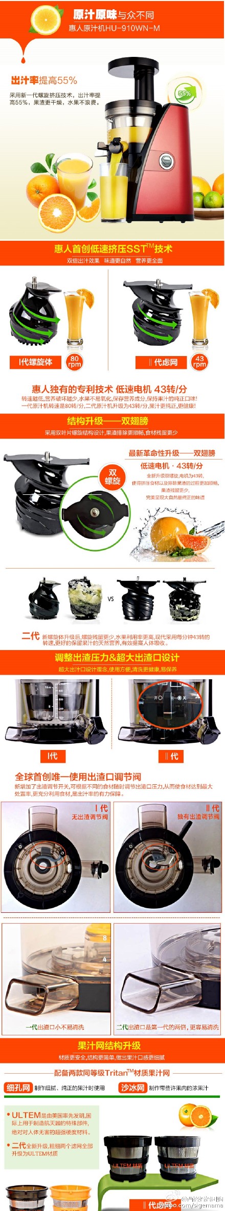 5/5周二10:00,韩国惠人原汁机4团,HU-780WN、HU-910两型号,都是韩国整机原装进口,780WN团1950元,15年最新型号910团2280,整机保修1年,电机包5年!惠人,原汁机鼻祖,低速榨汁,完好保存水果原有鲜味外,出汁率和果肉干燥度都是一等棒,合作多次的一级经销商,超低团价额外再送韩国锅