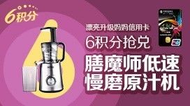 银联漂亮升级妈妈信用卡受邀客户同时满足以下2个条件,可在2017年11月21日至11月22日期间使用6积分抢兑膳魔师低速慢磨原汁机(型号:EHA-2101A)1个,限量1988份,先兑先得。