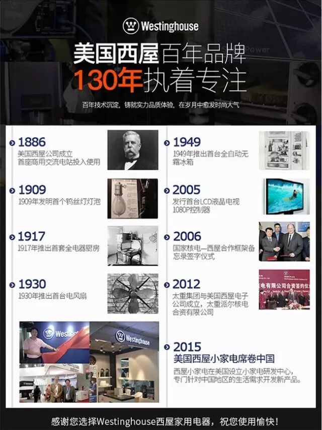 西屋是有130多年的美国高端小家电品牌,它的创始人乔治.威斯汀豪斯与爱迪生被誉为点亮世界的伟人,将高压交流电引入输电系统,并被世人广泛使用。