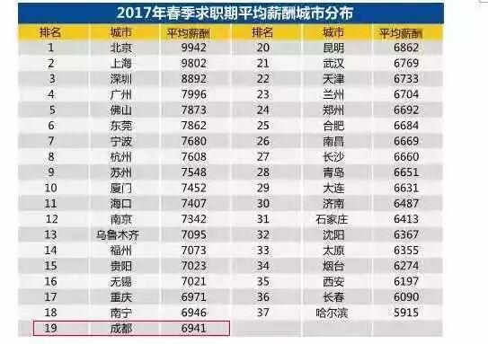 上半年,智联招聘发布的一份2017年春季求职期平均薪酬单,可以清清楚楚地看到,成都的平均月薪高高高高高达6941元!