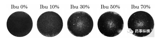 图1 不同布洛芬含量压片10 min后上冲表面图片(压力为10 kN,0.5%的Mg-St)