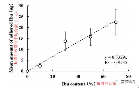 不同布洛芬含量的粉末压片10min后上冲粘附量试验中含0.5%的Mg-St,压力10 kN,(平均值±S.D.,n=4)。