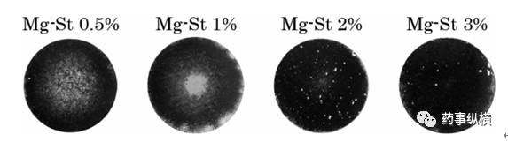图6 不同Mg-St含量压片后上冲表面照片(压力10kN,布洛芬30%)