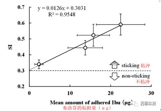 图4 粉末SI与粘附在冲头表明布洛芬的平均量之间的关系图
