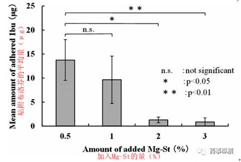 图7 不同Mg-St含量粉末压片十分钟后平均布洛芬粘附量