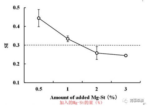 图5 加入不同比例Mg-St时的SI值(布洛芬占30%)(平均值±S.D.,n=9)