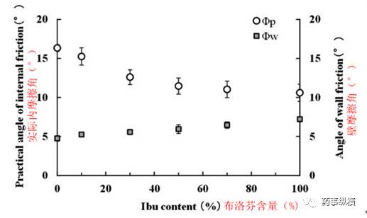 从粉床剪切试验、粉末与冲头表面的剪切试验中得到Φp和Φw的值。图3中有不同布洛芬含量的粉末的Φp和Φw值,随着布洛芬含量增加,Φp值减小,并逐渐接近布洛芬的Φp值(10.6±1.1°)。处方中其他辅料改善了粉末的流动性和粉末填充剪切室的速率,导致沿剪切平面的摩擦力和粘附力增加。