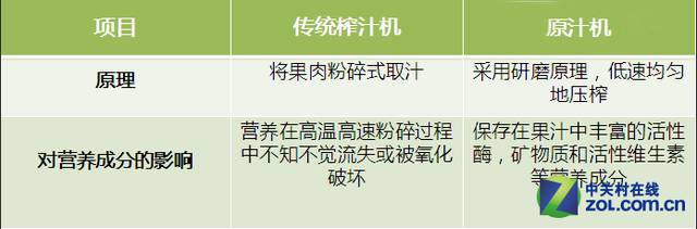 通过上表我们可以很好的理解,传统榨汁机将果肉以粉碎的方式取汁,营养在高温高速粉碎过程中不知不觉流失或被氧化破坏,有时候果皮上的农药残留,也随着粉碎混入果汁。而原汁机不是传统的水果粉碎机,而是采用研磨原理,它低速均匀地压榨出保存在果汁中丰富的活性酶,矿物质和活性维生素等营养成分,轻松榨取百分百果蔬纯原汁,它的汁渣分离技术有效排除重金属和农药残留,美味、健康果汁轻松获得。