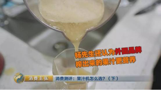 在口感方面,以美的原汁机为代表的国产品牌可以说完胜外国产品,但一些不明真相的消费者,仍然会对国外品牌抱有偏爱,比如《消费主张》栏目里的这位杨先生,他认为:外国品牌榨出来的果汁更营养。