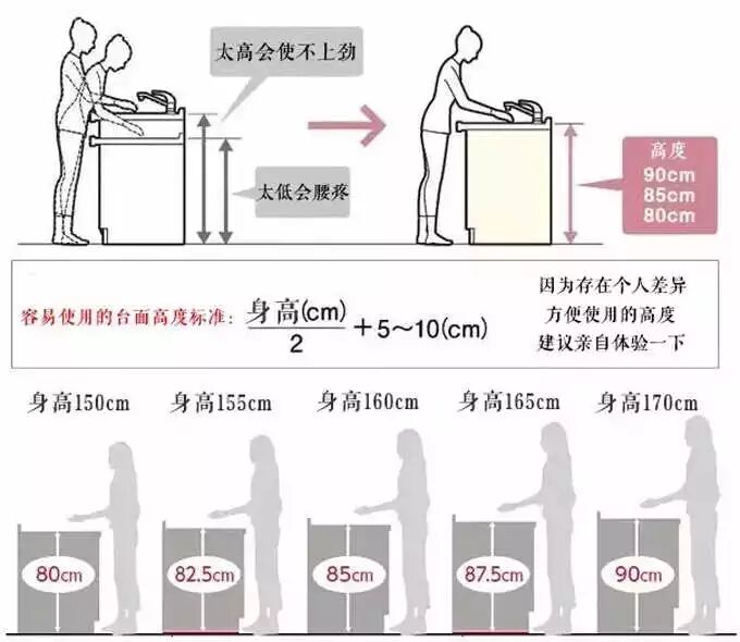 有个简单的计算公式:身高÷2 +(5-10)cm,这是最舒适的台面高度,记得用最常使用厨房的人的身高去计算哦~