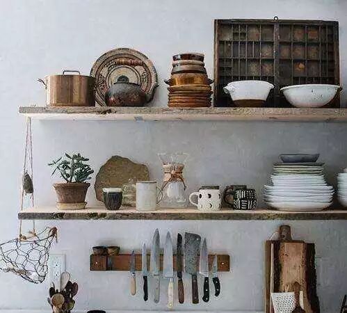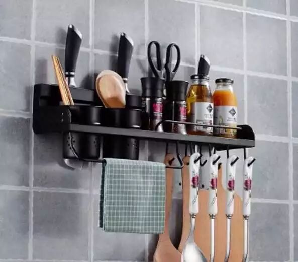 墙面空间应该充分利用,宜家的磁性刀架非常好用,刀很快就干了。挂杆也很方便,抹布、铲子、漏勺都能挂上面。