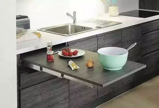 厨房台面标准宽度是60cm,当然装修也是个量身定做,如果户型小的,台面不能太宽,抽拉隔板可以在狭小的空间为你增加更多台面面积。