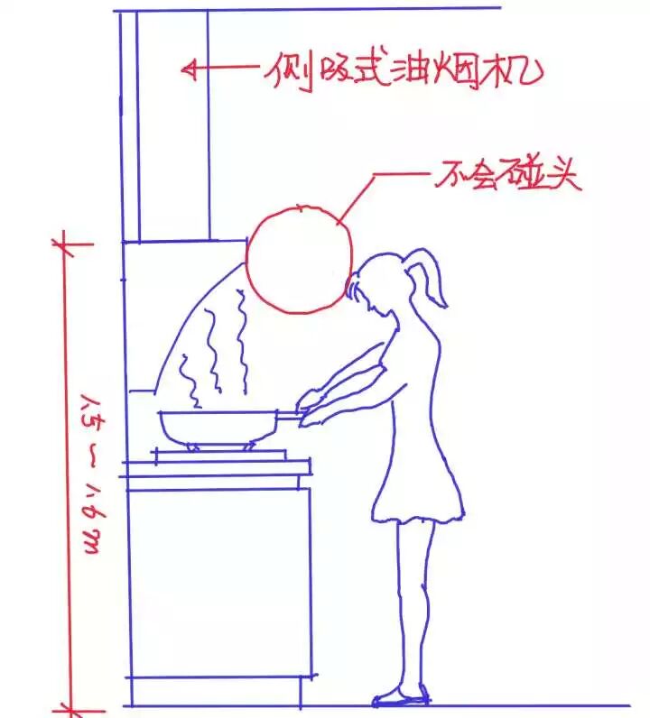 为了防碰头,把油烟机弄高一点,油烟又会变大,所以要选择侧吸油烟机。
