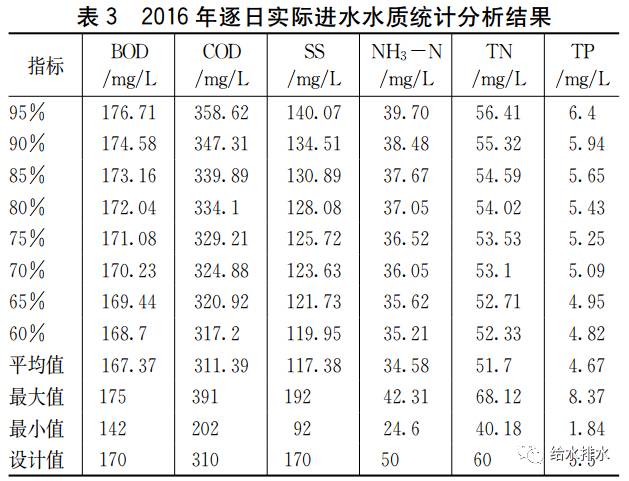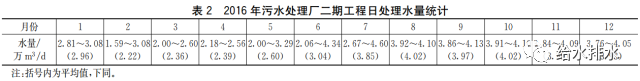2016年该厂二期工程处理水量统计分析见表2,进水水质统计结果见表3。