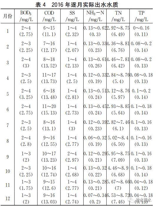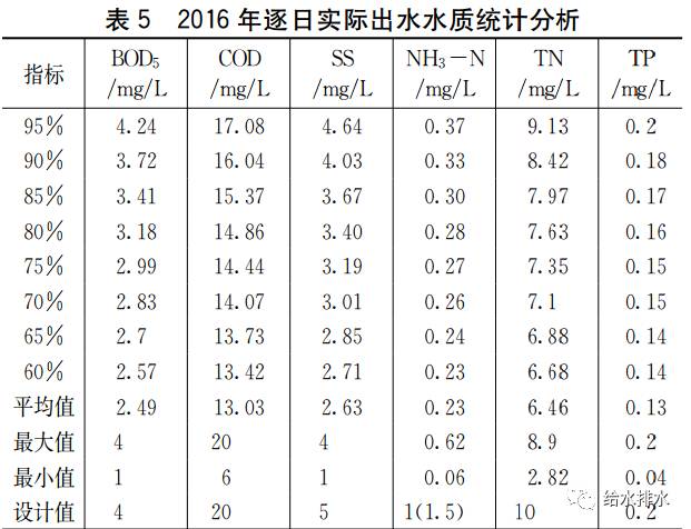 工程2016年逐月实际出水水质见表4;对2016年逐日实际出水水质进行数理统计分析,结果见表5。