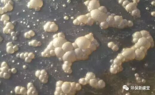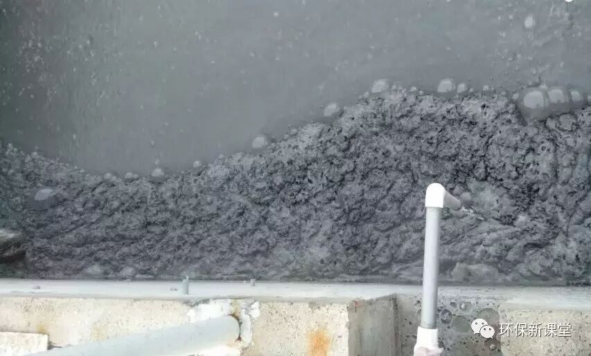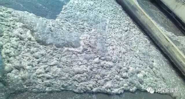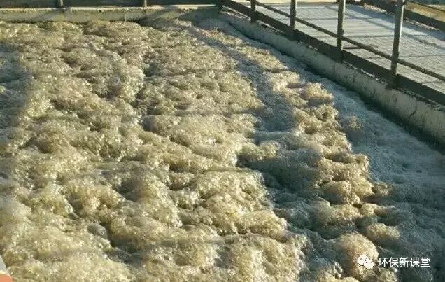 具体说下两者的区别,非丝状菌膨胀是因为过高的碳源进入系统,在高基质下,细菌吸附的碳源代谢不了,并在细菌表面分泌出亲水性多糖,并部分进入系统,细菌处于对数期,这时候细菌具有最强的活性,导致菌胶团解体。丝状菌膨胀是因为丝状菌的过渡繁殖,丝状菌伸出菌胶团,并与其相邻的丝状菌形成松散的絮团,导致絮团密度减少严重影响沉降性能。其中最明显的表观区别是:丝状菌膨胀和非丝膨胀在曝气池区别是一个是浮泥,一个是泡沫!所以我们来了解一下非丝膨胀的泡沫。
