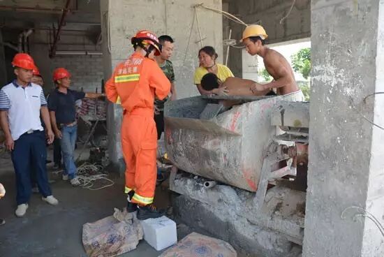 中队到场后发现:现场为一名男子在进行作业时,左手不小心滑入混凝土搅拌机的搅拌池中,小臂以下全部被搅拌机的叶片卡在池内。