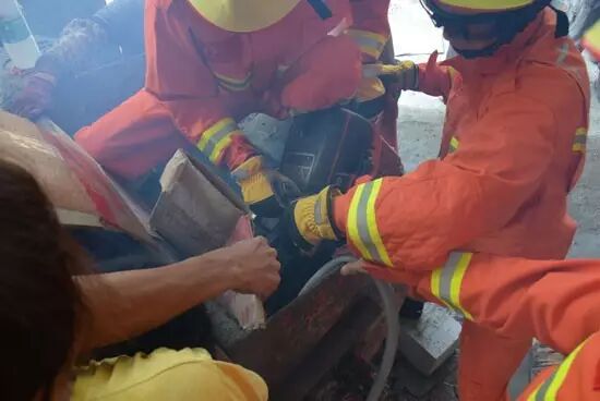 副中队长杨定杰立即安排中队具有救援经验的官兵操作金属切割机,对搅拌机的传动轴进行切割。准备救援时,被困者因疼痛出现情绪不安、躁动的现象,消防官兵立即对其进行安抚,确保救援顺利进行。