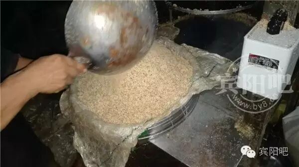 蒸煮好的花生粉,放到炒锅上去炒,这道工序是整个榨油流程的重点环节。炒得太湿或太干,液压出来的花生麸硬度不达标,出油率跟不上。必须炒得有一定的粘性,这样才能保证出油率。同样,以前也是人工搅拌炒粉,不仅温度高,而且特别累,现在炒锅上安装了一个电动搅拌机,机器代替了人工。方便多了。