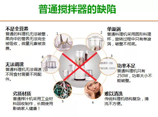 普通的食品料理机首先不是全营养,无法破壁;有的是单漩涡,破壁不彻底;功率太小,难以清洗,劣质材质工业废料,不能调速等等缺陷!