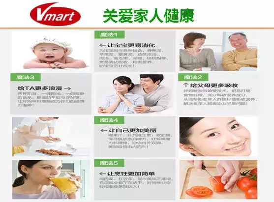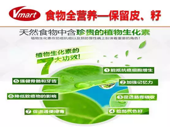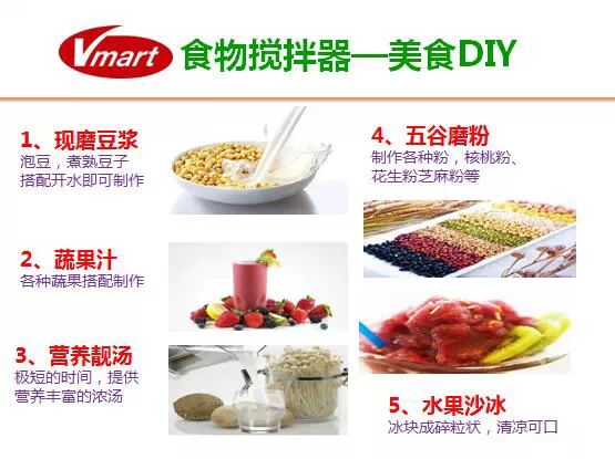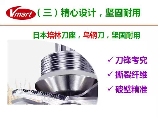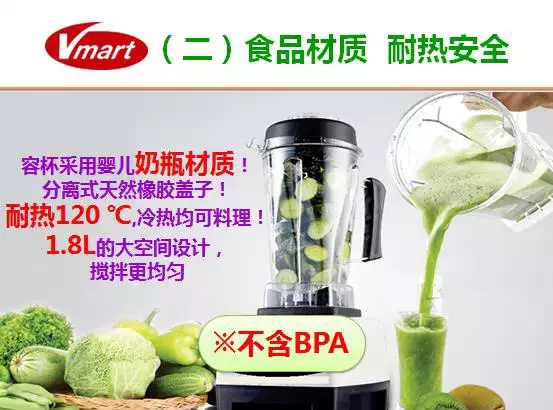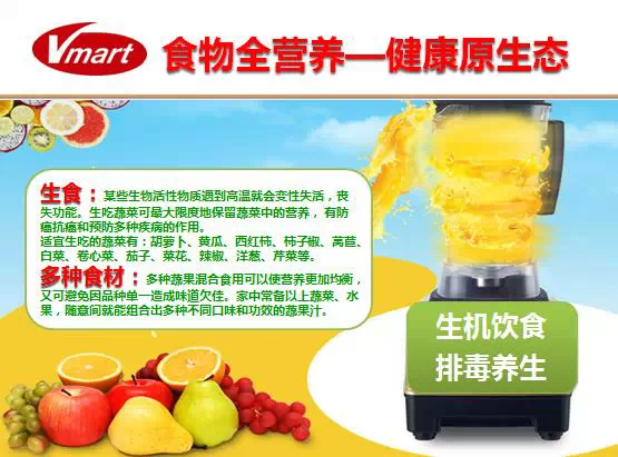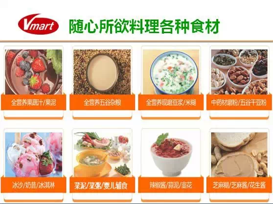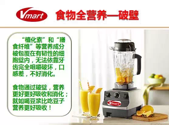 Vmaart食物搅拌器可以做到第一,全食全营养,健康原生态;2.5匹,30000转,1300W。瞬间击破细胞壁,使营养成分充分被人体吸收!瞬间击破细胞壁,使食物养分和纤维组织易于人体吸收