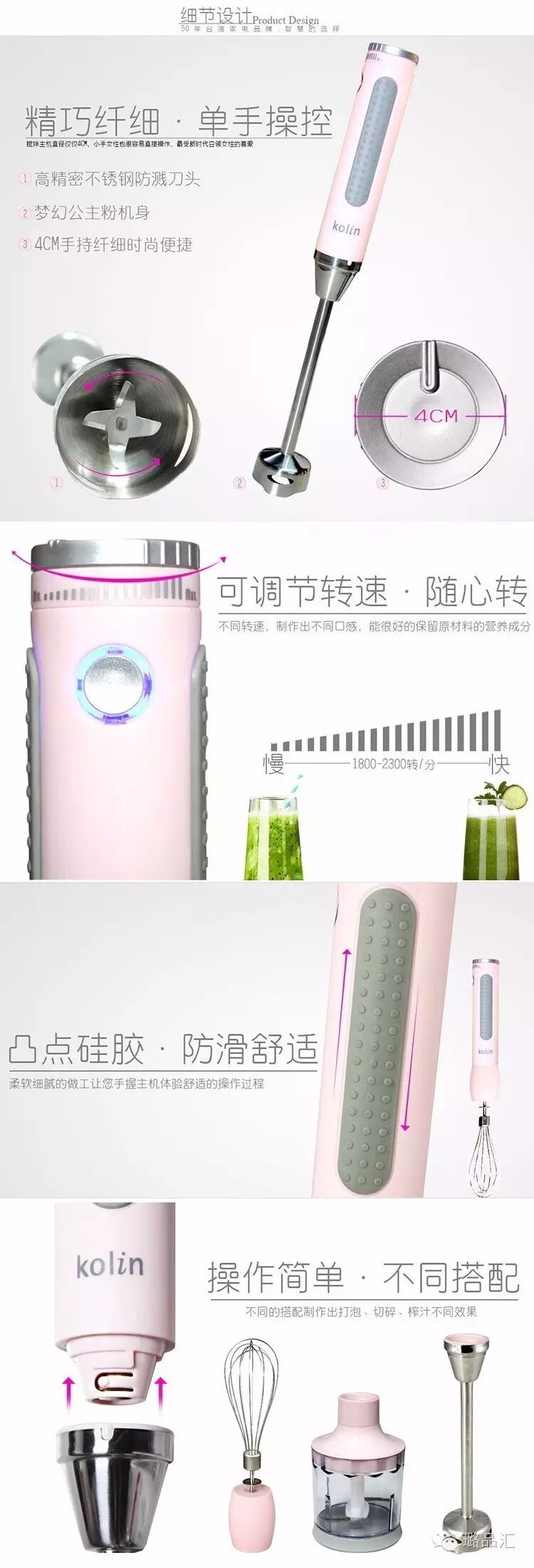 台湾KOLIN歌林家用多功能搅拌机,萌萌的粉色,颜控第一眼就被征服了!手持操作简便,榨汁、研磨、切碎、打泡,一机满足全家所有人的需求,有小宝宝的绝对是做辅食好帮手,功能多,各种泥做起来,因为我家是混合喂养,4个月就要开始添辅食了,时间晃晃很快的,作为囤货党,我也提早备上了~平时自己做个奶昔、打个蛋、绞个肉啥的都能用上,性价比极高!团178包邮除偏,前5晒单好评返现3元~