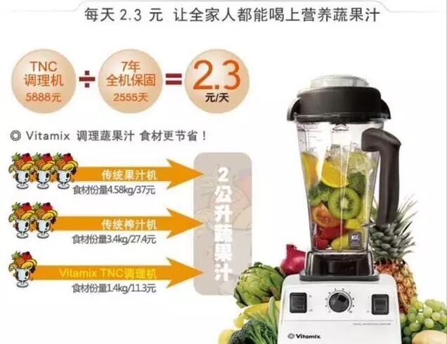 美国国家癌症中心建议,用Vita-Mix可节省62%的成本。调理相同份量的蔬果汁,节省3倍多的食材份量及成本,每年即可比传统果汁机省下约9300元。同样做出2公升果蔬,传统机器和维他美仕所花费用对比▼