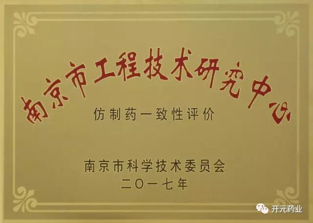 经主管部门初审、专家评审、现场核查等程序,江苏开元药业有限公司“南京市仿制药一致性评价工程技术研究中心”获得南京市科学技术委员会正式认定,并予以挂牌。