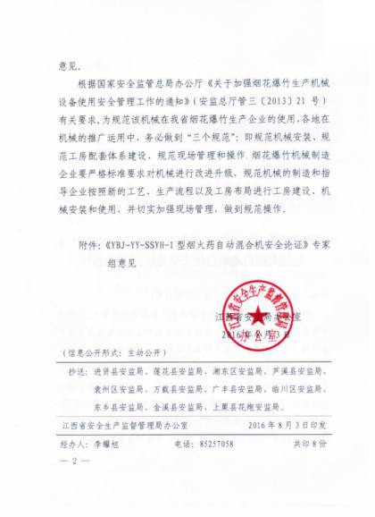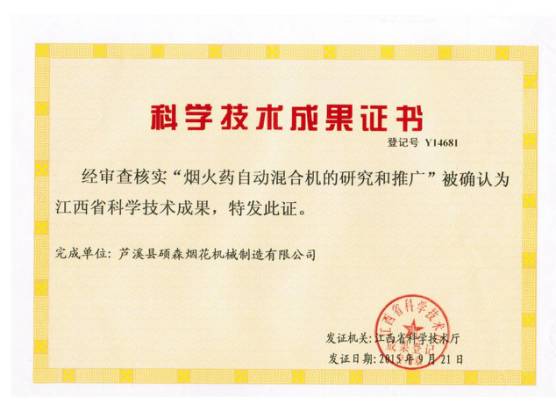 江西芦溪县硕森烟花机械制造有限公司三年前经过在当地安监局报备,自制了一台基本符合上述要求的混药设备,且通过了江西省科技厅及江西省安监局组织专家的鉴定,硕森机械为了更进一步提升该设备安全及质量,于2016年初与浏阳市荷花精工机械制造有限公司合作,荷花精工机械科研团队通过对部分烟花生产企业调查走访,确定该设备采用不锈钢机身能有效消除设备在筛混时机体内静电的积聚,采用卧式设计,有效降低了设备高度,规避了药物使用机械搅拌的被动性,取消了振动筛药方式。