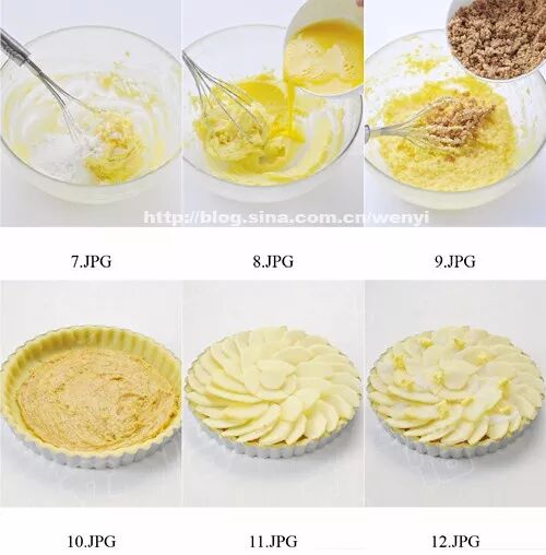 9)在做好的派皮上均匀的涂抹一层杏仁奶油馅(图10),然后将切成薄片的苹果均匀的码放在派皮上(图11),再均匀地在上面撒上细砂糖和黄油丁(图12)。
