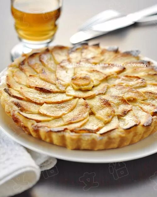 **苹果片要由外圈向里圈一团一团的铺,外圈的苹果片可以遮住模具的边缘和派皮,在烤的过程中,它会慢慢软下来,缩回到派皮的内部。