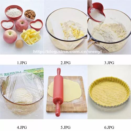 5)然后将面皮压入派盘中,并用手指将模具内的花纹压出,用擀面杖擀去模具上方多余的面皮。接着用叉子在面皮上扎一些孔备用(图6)。