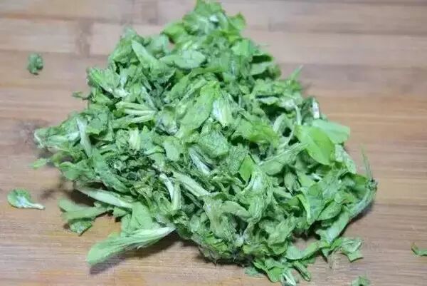 3、艾叶过一遍开水后用刀剁碎,然后放入锅里加一点点水和少量糯米粉炒成糊