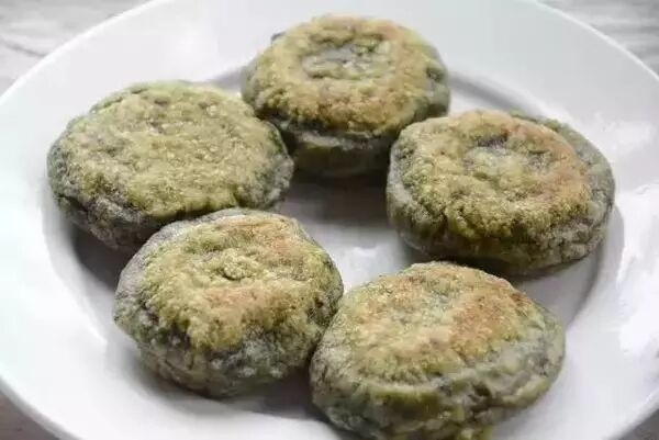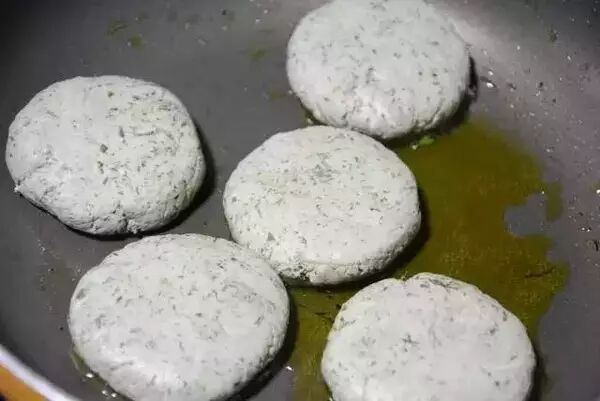 5、揉成圆形,之后再按扁。锅里面倒入少许油,烧热之后,放入按扁的清明草馍馍,小火煎。
