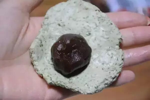 4、揉成面团后,取一小块面团,然后里面包裹豆沙,其实就和包汤圆一样呢;