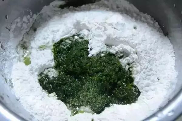 3、加入适量的艾草,先把中间的粉搓合成小团,然后慢慢的把边上的粉也混合进去,慢慢的揉,把面团越搓越大。