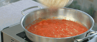 3.雅格炒锅内,倒入橄榄油,放入蒜片,出香后放入番茄丁煸炒,再放入打好的番茄汁,收汁