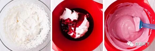 将覆盆子果泥加入蛋白,用橡皮刮刀搅拌均匀。
