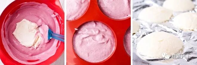 将《覆盆子慕斯》倒入半圆形硅胶模具中的1/2位置