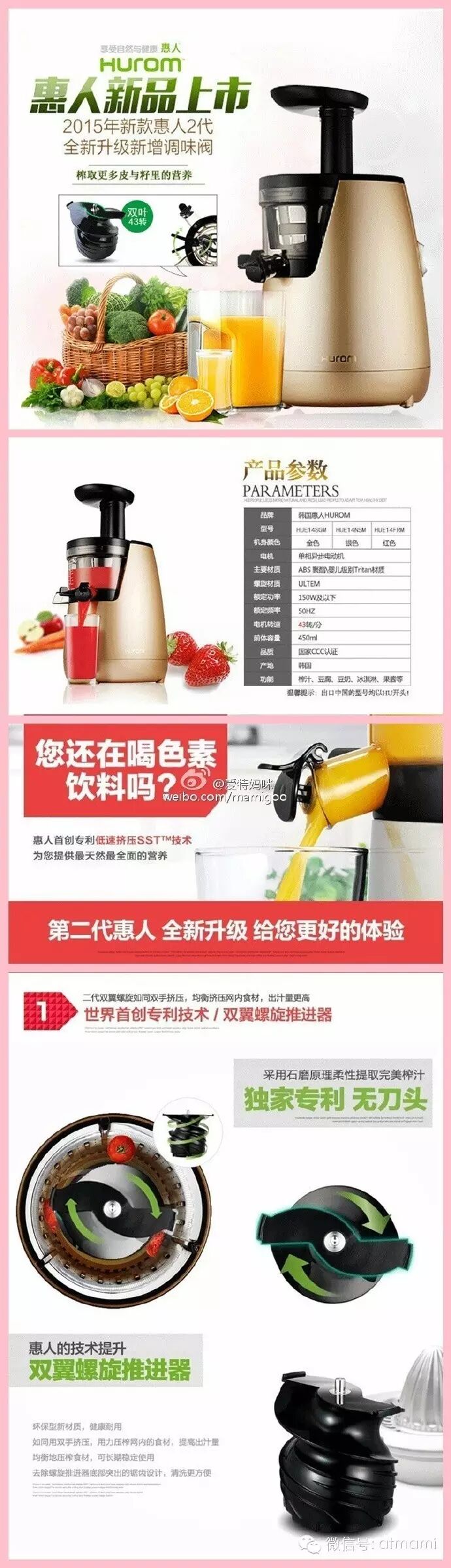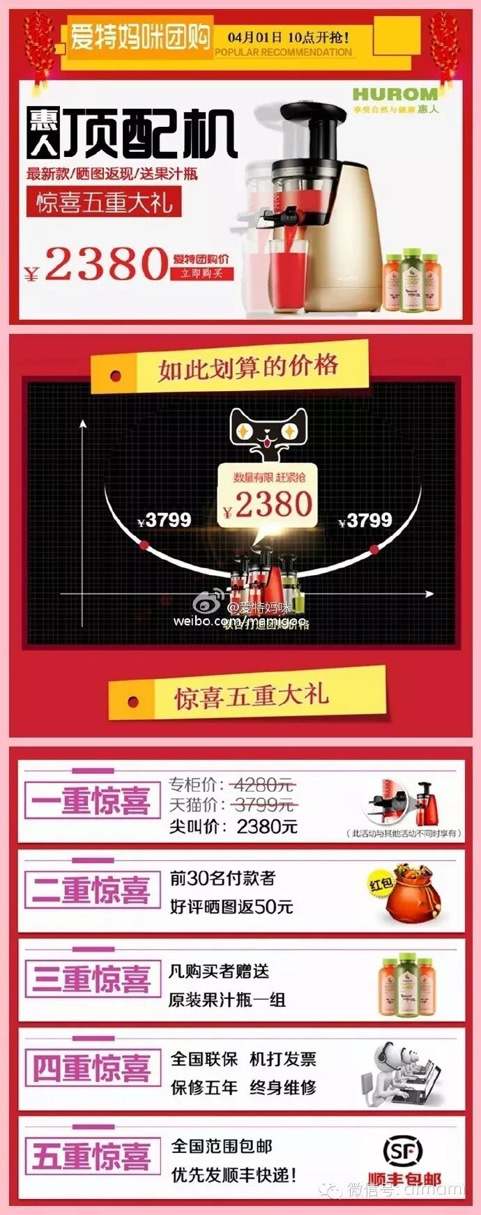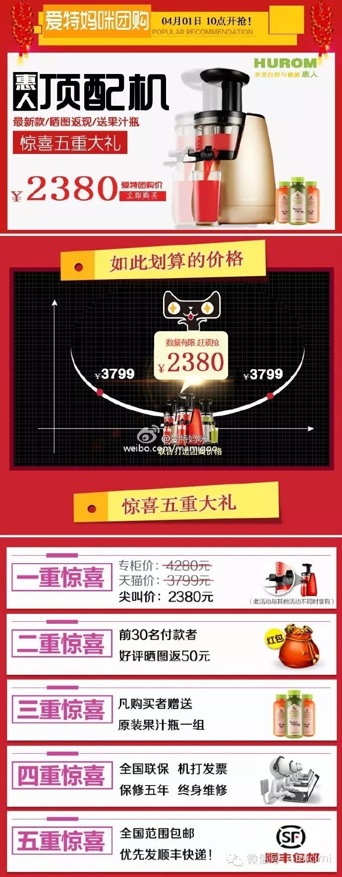 #1号上午10点#又到了原汁机的高试用季节了,这次我们来一个顶配版最新款的惠人原汁机,惊喜价格只要2380,专柜售价4280,天猫3799的款哦,前30名晒图再返50元,送原装果汁瓶,全国联保加机打发票,全国顺丰包邮......这些真的不是愚人节的玩笑,不相信你就买了试试