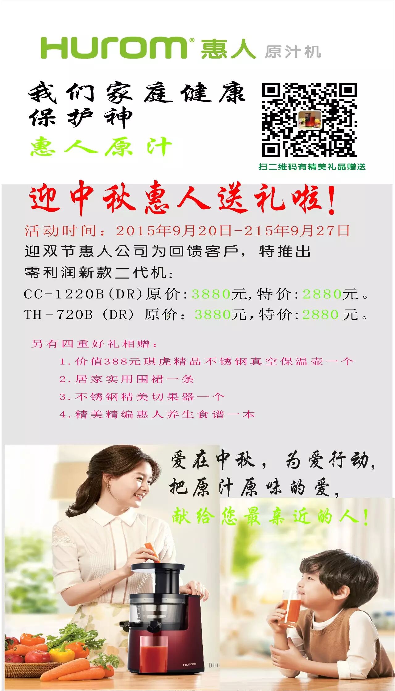 为了庆祝2015年中秋佳节来临,惠人公司倾情感恩回馈客户,特推出零利润特价机,型号分别为:CC-1220(DR)、新款上市TH-720(DR)两款原汁机,全国专柜价3880元,感恩价:2880元,同时馈赠琪虎高端不锈钢真空保温壶一套、家庭时尚围裙一条,不锈钢切果器一个、惠人精编养生食谱一本。