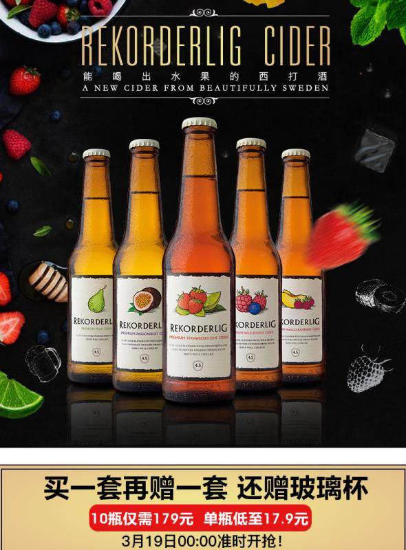 来个高大上的,喜欢看英剧的可能知道欧洲人喜欢喝果酒,英文叫cider,但是除了英国,还有一个传说中做cider做的最好的国度,那就是瑞典。瑞典的cider——Rekorderlig不知道征服了多少人,不仅仅是酒吧,连咖啡馆都很多人点。这间公司的cider口味可说是夸张地多。基本上单瓶的价格折合在RMB50左右,天猫旗舰店这个算是临期促销吧,5瓶179,还买1送1,相当于17.9元1瓶,还送鸡尾酒杯,对于想尝试欧洲顶级果酒,又对价格望而却步的人来说,这绝对是是个好机会。而且一次性尝遍所有口味¥wDCYNwKbSW¥