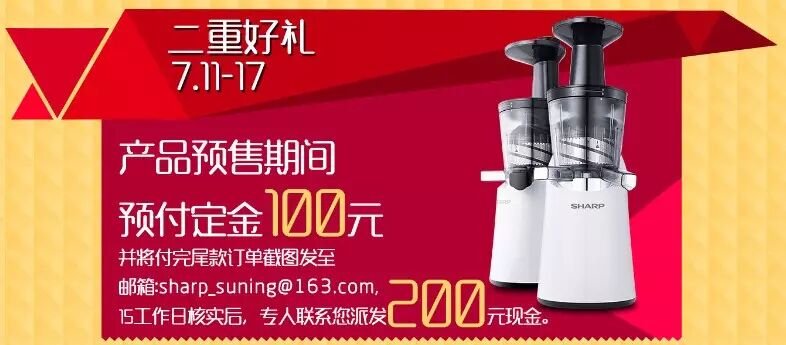 凡是7月11日-7月16日支付定金,7月17日付尾款,预订购买原汁机成功的顾客,好评晒单后,将晒单截图(好评晒单截止日期为8月10日、好评字数不少于30字、图片不少于5张)+预订订单截图+易购账户+姓名+联系方式发至邮箱sharp_suning@163.com,审核通过后,工作人员在联系后,七个工作日内通过银行转账方式返现200元!