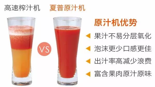 第二代原汁机拥有一颗强大的高品质电机,能轻松应对坚硬的蔬果食材与纯果冰淇淋。针对许多人担忧的榨汁所产生的热量会加速水果氧化、致使营养成分流失,夏普原汁机则采用了慢速研磨法。32转/分钟超低转速,保证果汁纯正、细腻的口感!用小番茄来做实验,夏普原汁机相比高速榨汁机有如下明显优势:①果汁不易分层氧化;②泡沫更少口感更佳;③出汁率高减少浪费;④富含果肉原汁原味。