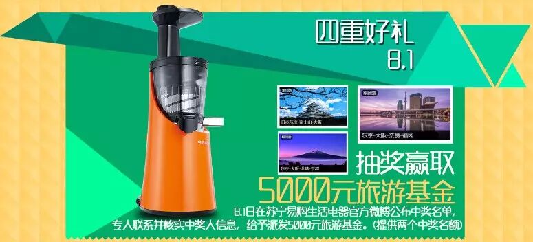 凡在7月31日前晒单好评的顾客,苏宁易购将抽取2名幸运大奖,于8月1日在苏宁易购生活电器官方微博公布中奖名单,赢取价值5000元旅游基金大奖!