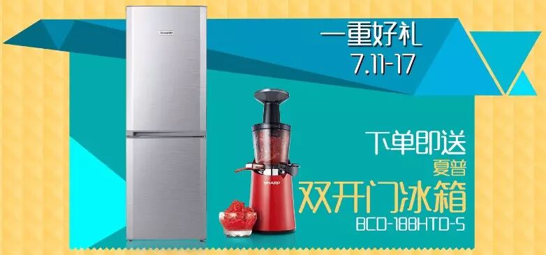 凡在7月11日-7月16日支付定金,7月17日付尾款,预订购买原汁机成功的顾客,送夏普双门冰箱BCD-188HTD-S一台!
