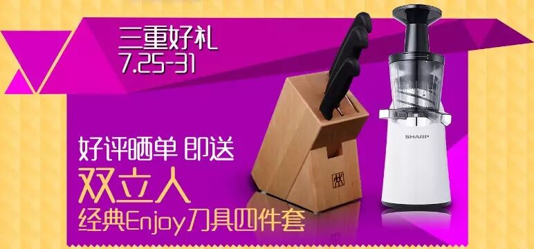 顾客收到产品后,在7月31日前晒单好评,并将晒单截图+订单截图+易购账户+姓名+联系方式发至邮箱:sharp_suning@163.com,经审核后,七个工作日内再单独寄送双立人经典Enjoy刀具四件套一套!