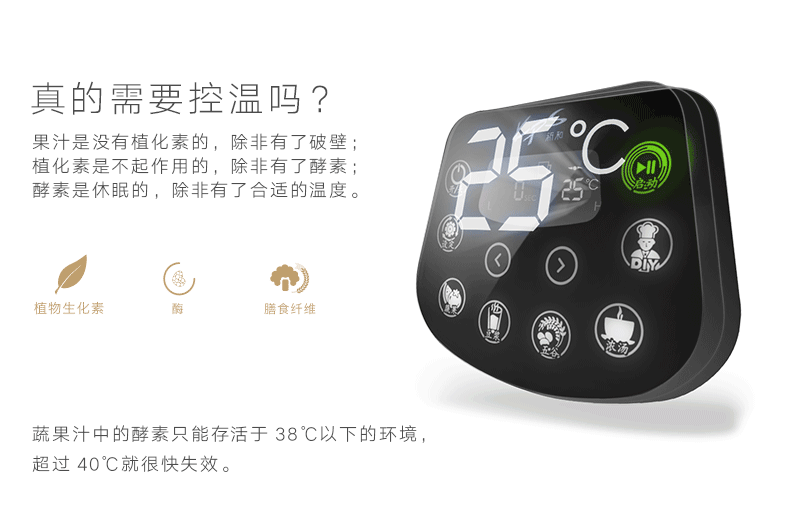 针对个人口感习惯,可以通过功能键调节相应的时间,使用冰水或添加冰块都可以降低蔬果汁的温度,并不会破坏任何营养成分。